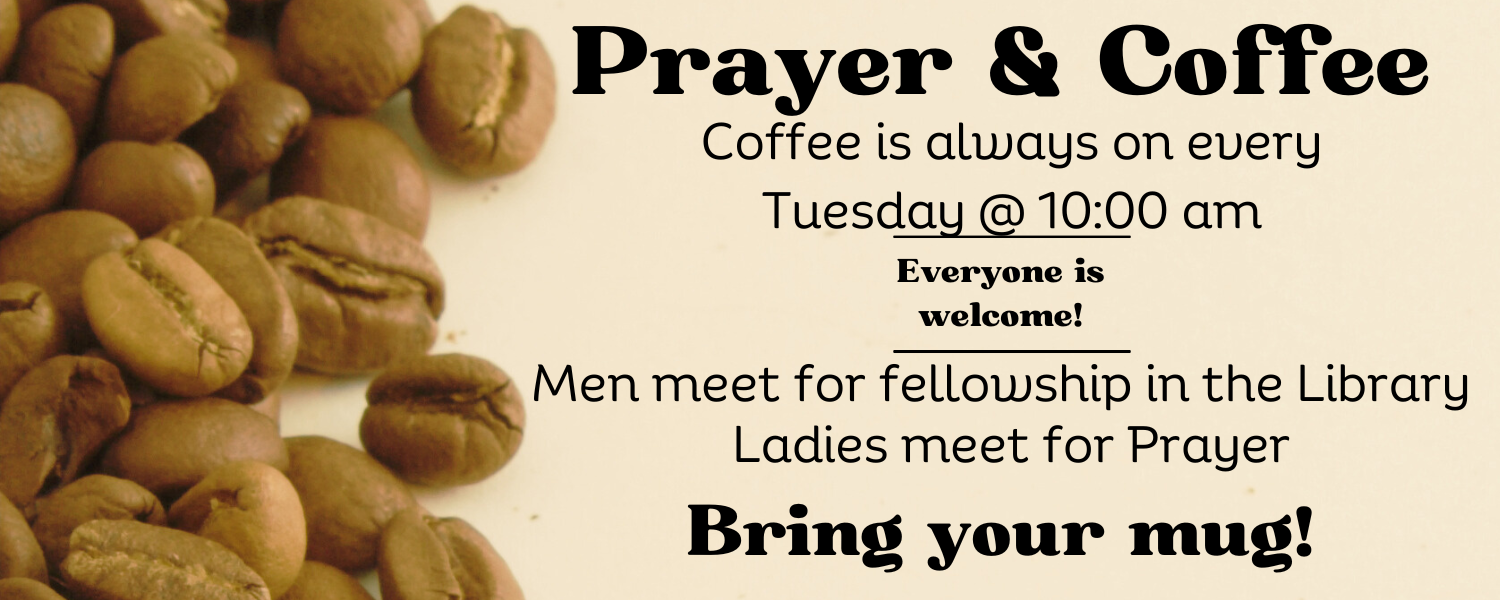 Calendar Prayer & Coffee Date Jun 17 2025 Start Time 10:00 AM End Time 11:00 AM Details Everyone is welcome! Back to Calendar